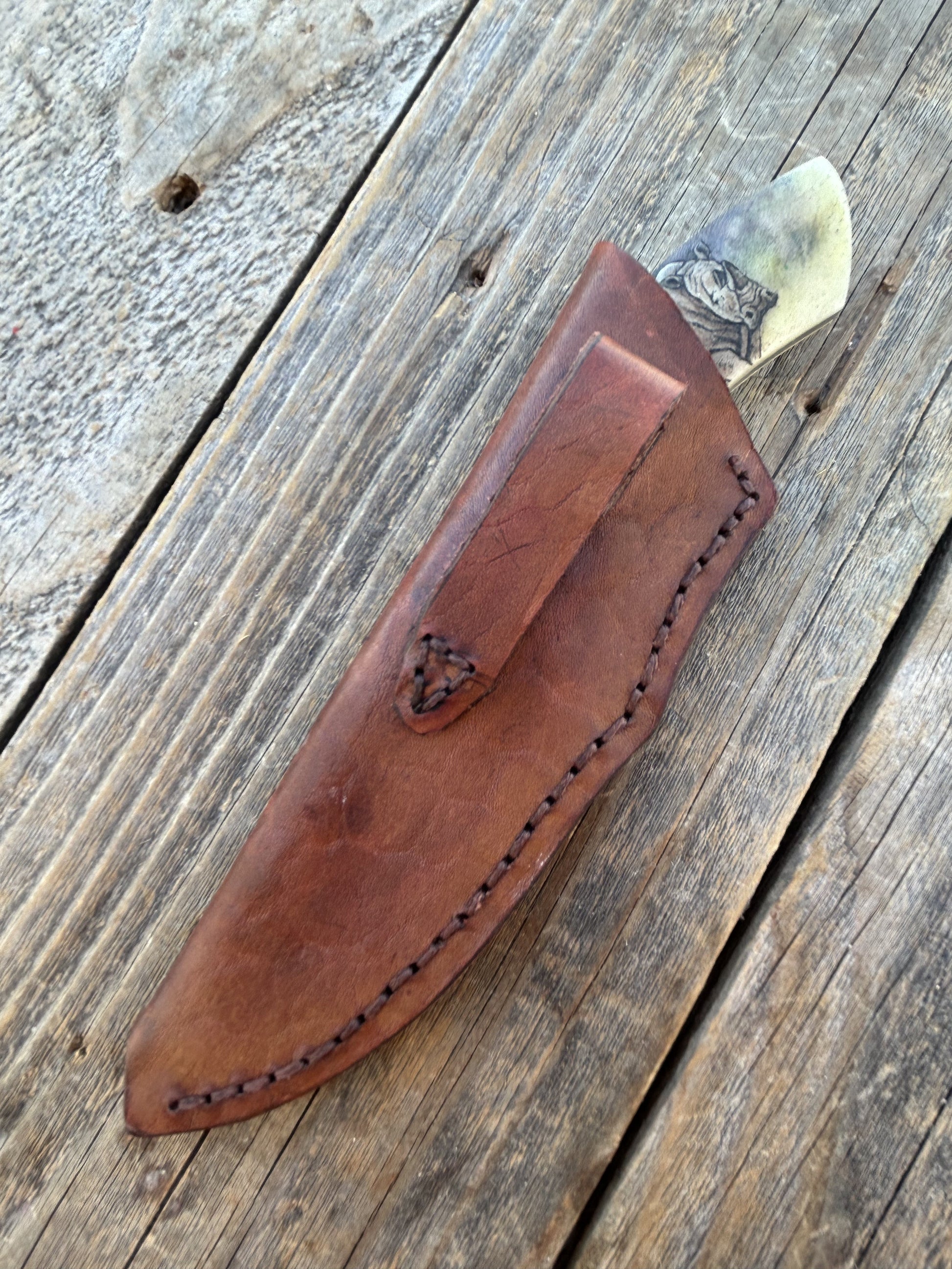 This smaller artisan knife from an early Nkosi collaboration, featuring a color scrimshaw engraving of a rhino mother and calf—symbolizing strength, protection, and legacy.